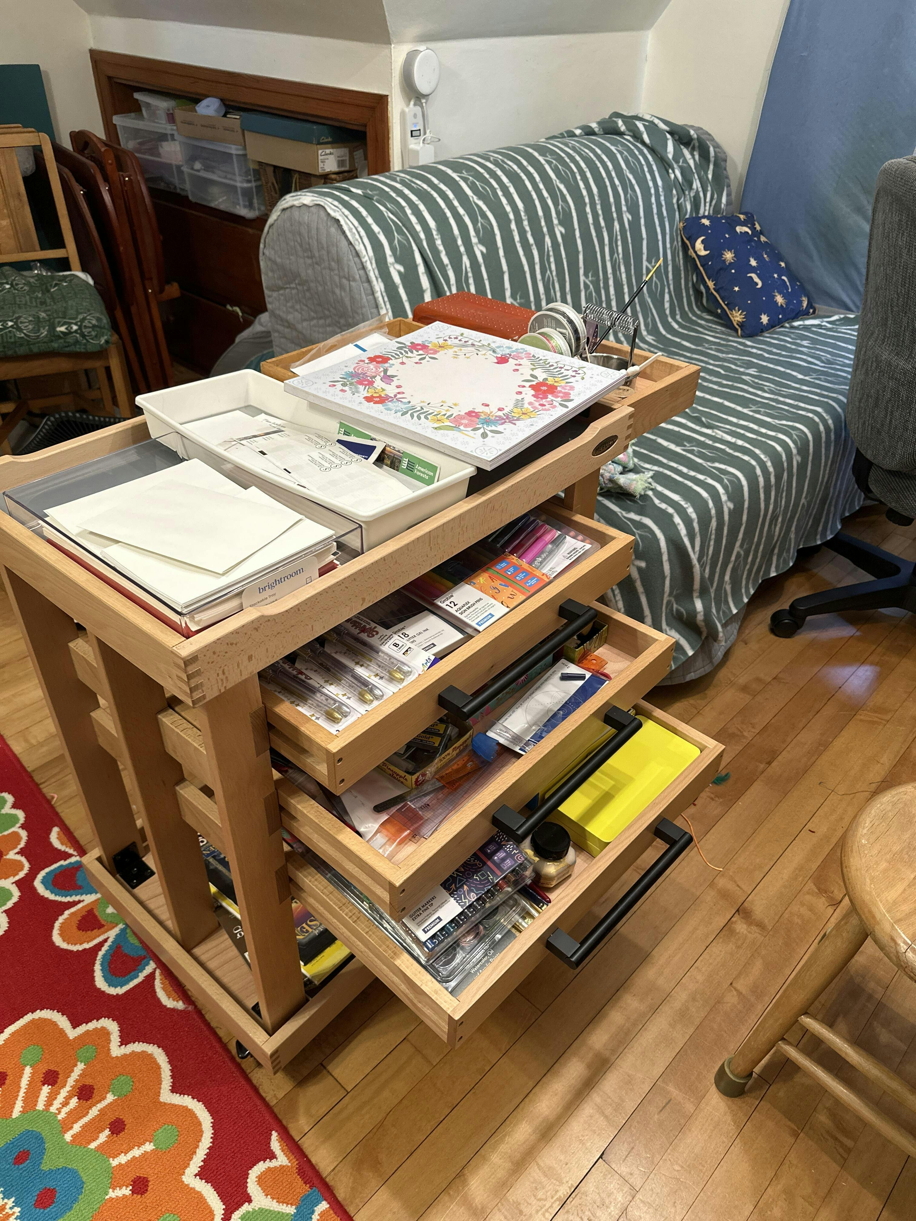 I am so glad that I purchased this cart. I can move it to where I am working and it stays. Organization of the different mediums I use makes this piece the best thing ever. It looks like great in my studio and best of all the quality of the cart is outstanding!