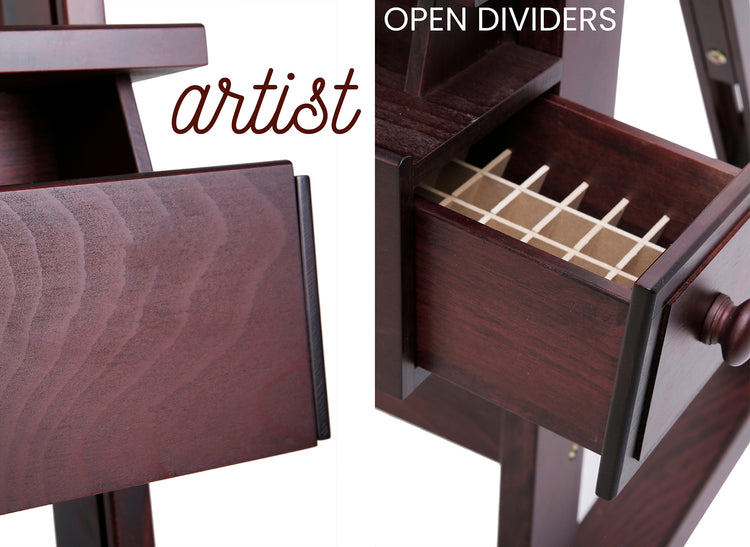 Powerful storage function to store your beloved painting supplies and paints,enough space (two open dividers, two pull-out drawers) to keep paint tubes, paint brushes, and oil knives neat and tidy.
