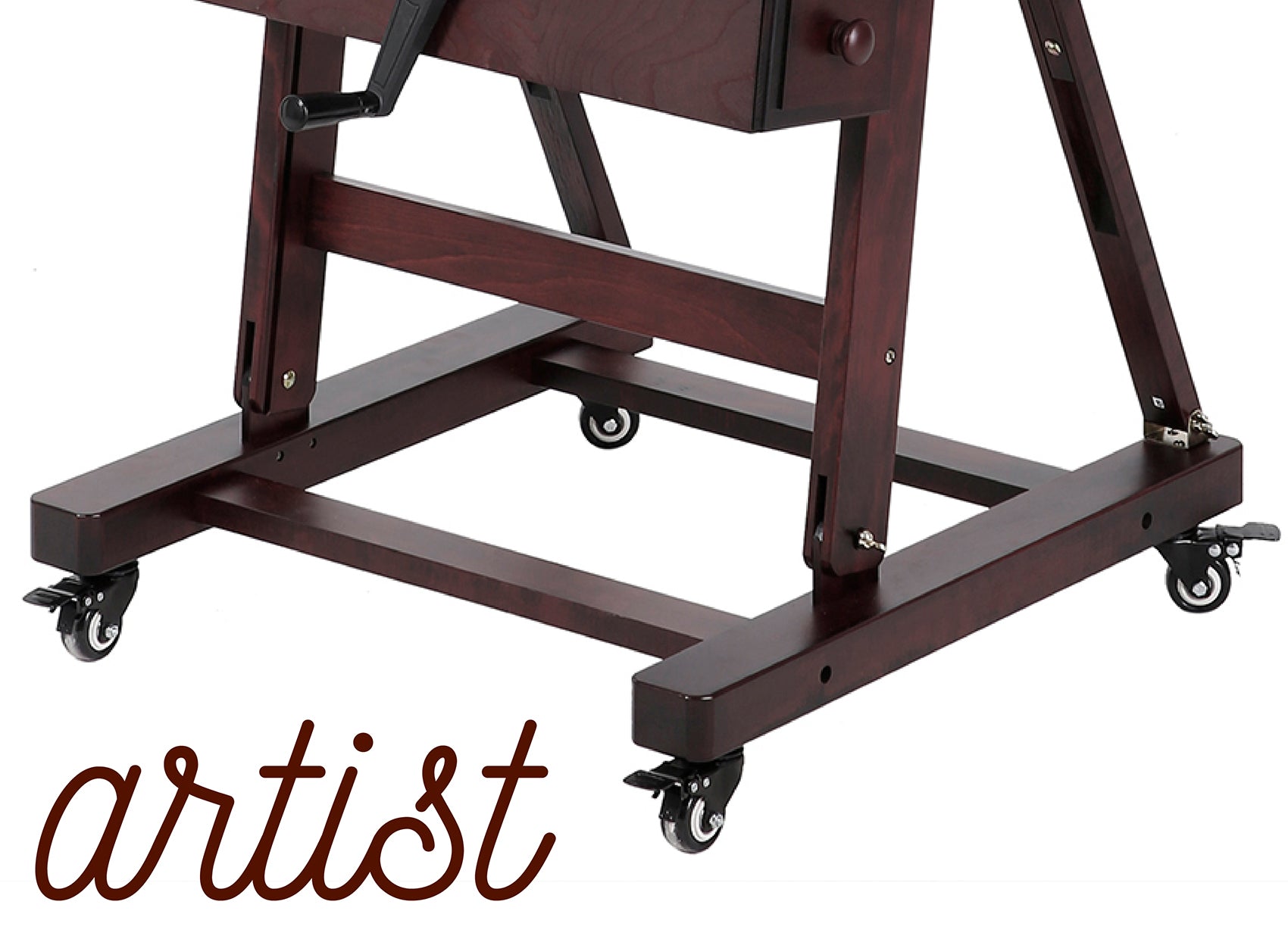 - Convenient Storage and Mobility: Specially designed with a front art supply compartment and two side storage drawers for easy access to supplies. For mobility, the floor easel is equipped with four 360-degree fully swivel castors and two up-front locking brakes on the castors to provide stability while painting. The deluxe and utility design, combined with master hand craftsmanship, makes this Crank Adjusting H-Frame Easel the most advanced crank-assist easel in the world.swivel castors, and two up-front locking breaks on the castors to provide stability while painting. The Deluxe and utility design, and master hand craftsmanship meet in this Crank Adjusting H Frame Easel, making it the most advanced crank-assist easel in the world!